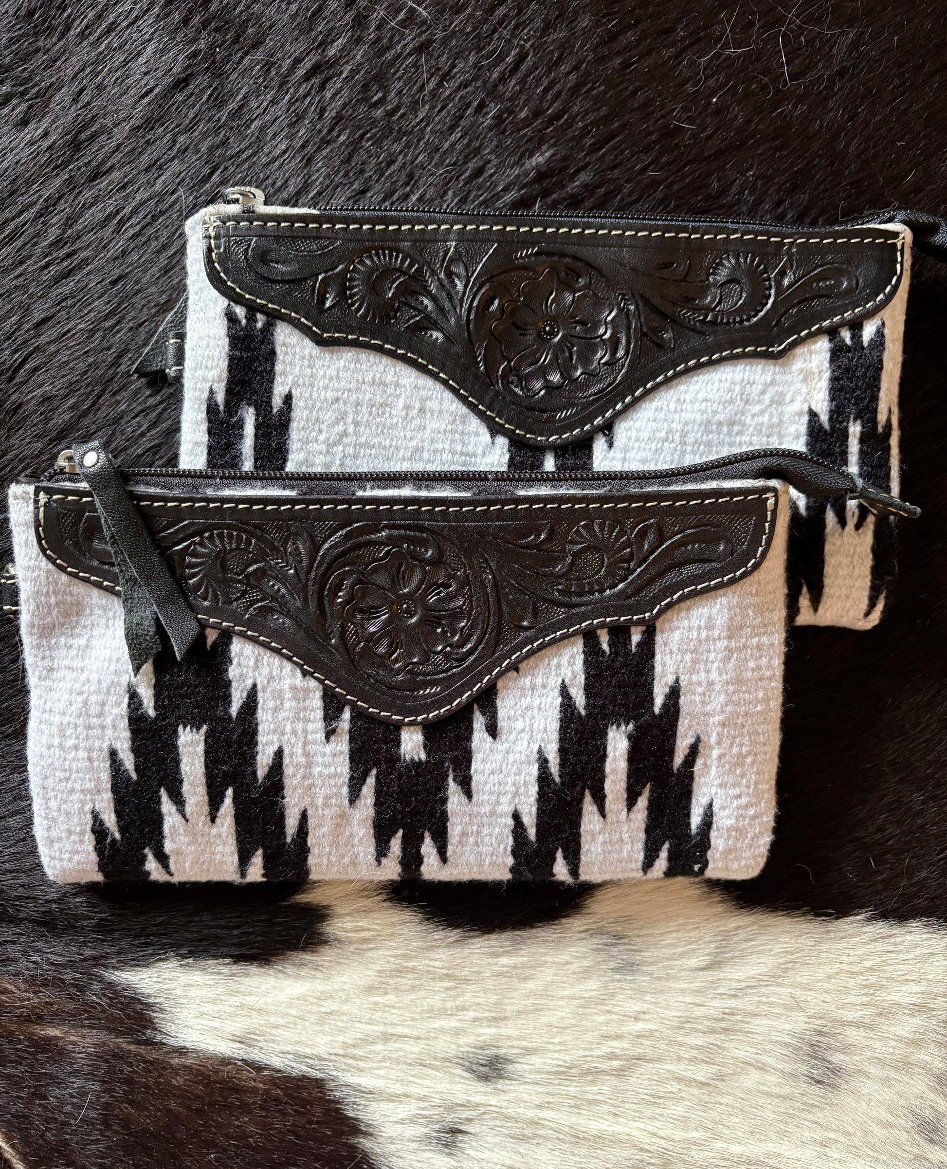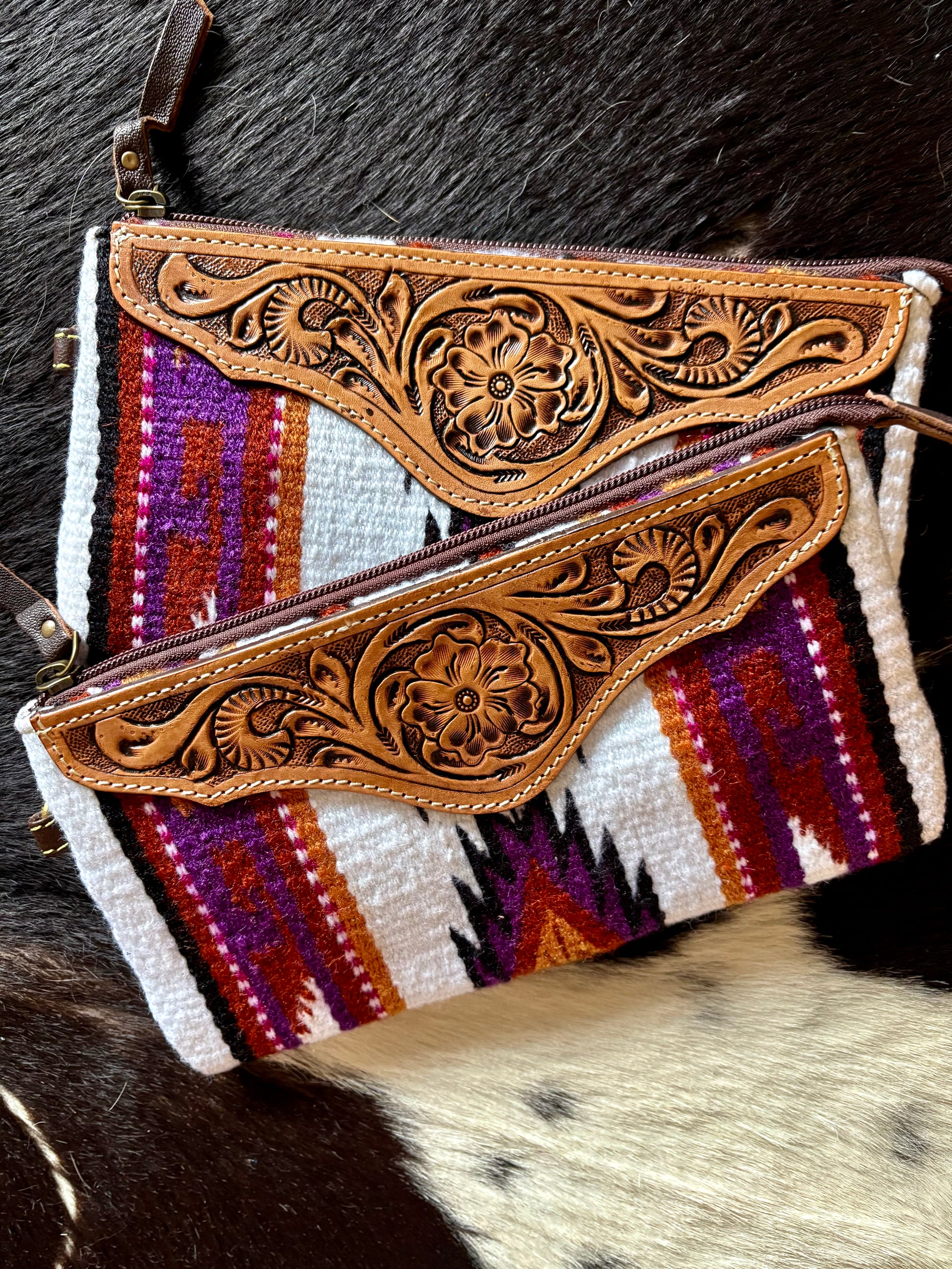 "Woven southwestern serape fabric wristlet with handtooled leather accents. Wristlet is 9.5"" x 5 1/4"" and is a perfect size for carrying your phone and whatever else might be needed for a night on the town. Wristlet has a zipper closure for security and has one zippered compartment on the interior