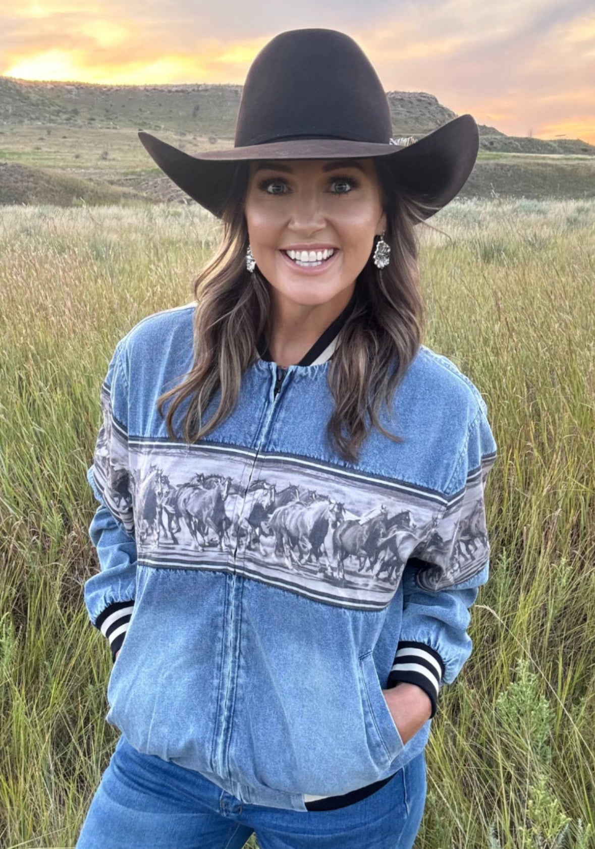 Embrace bold style and playful energy with the Bermuda Rush Bomber Jacket. This denim jacket features a spirited design of a herd of horses running, capturing freedom and movement in every detail. Perfect for adding a lively touch to your casual wardrobe, it combines classic bomber silhouette with a fun, dynamic print for a look that’s full of life and character.