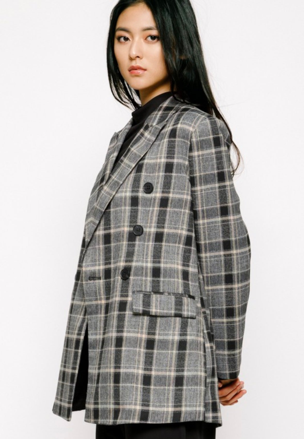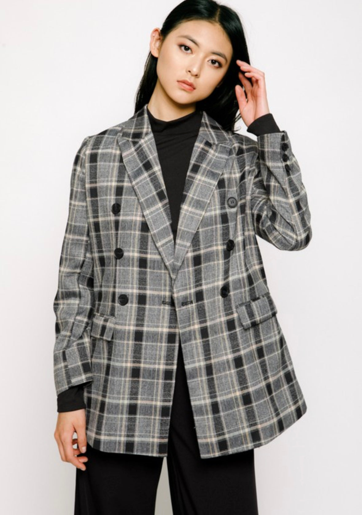 A structured double-breasted blazer in a cool-toned plaid pattern featuring shades of grey, black, and cream. Designed with an oversized fit, it includes wide lapels, front flap pockets, and black button detailing down the front and sleeves. The model styles it with a black high-neck top and black wide-leg pants for a chic, minimalist look.