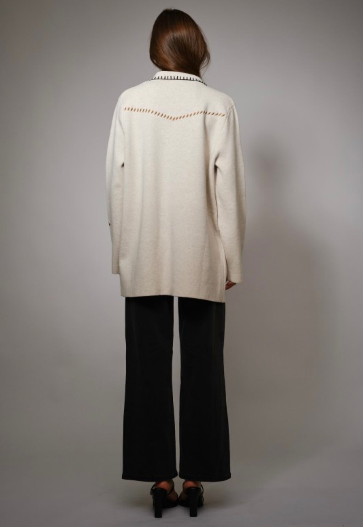 Step into effortless southwestern style with this beautifully detailed cream jacket. Crafted with a soft, cozy feel, it features standout western-inspired embroidery including horses, rope accents, cowboy hats, and saddle motifs. The contrast whipstitch trim along the collar, placket, pockets, and hem adds a handcrafted touch, while the silver-tone buttons complete the look.