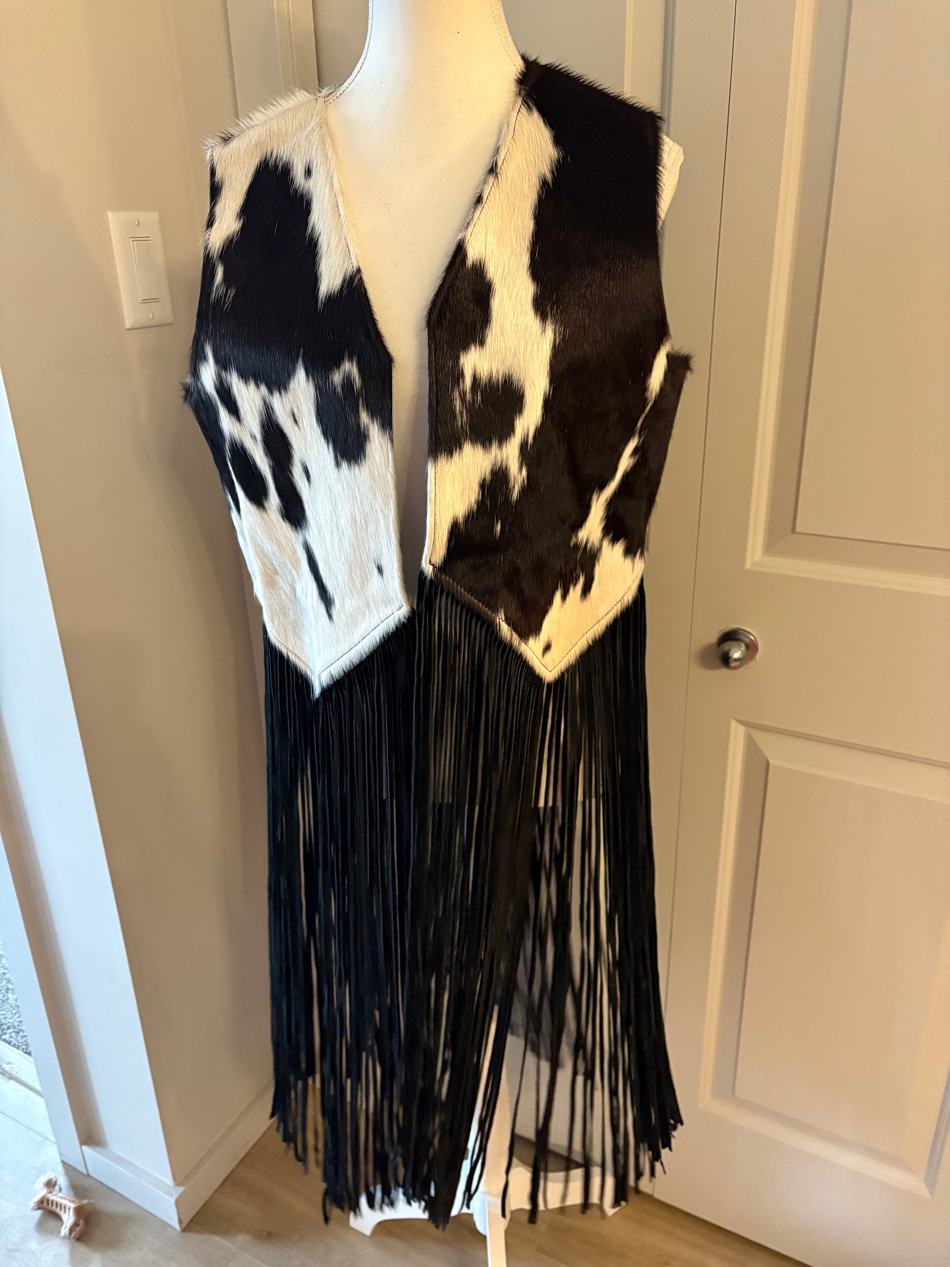 This genuine cowhide vest features a v-shaped hemline with fringe. Perfect for concerts or rodeos, year-round.