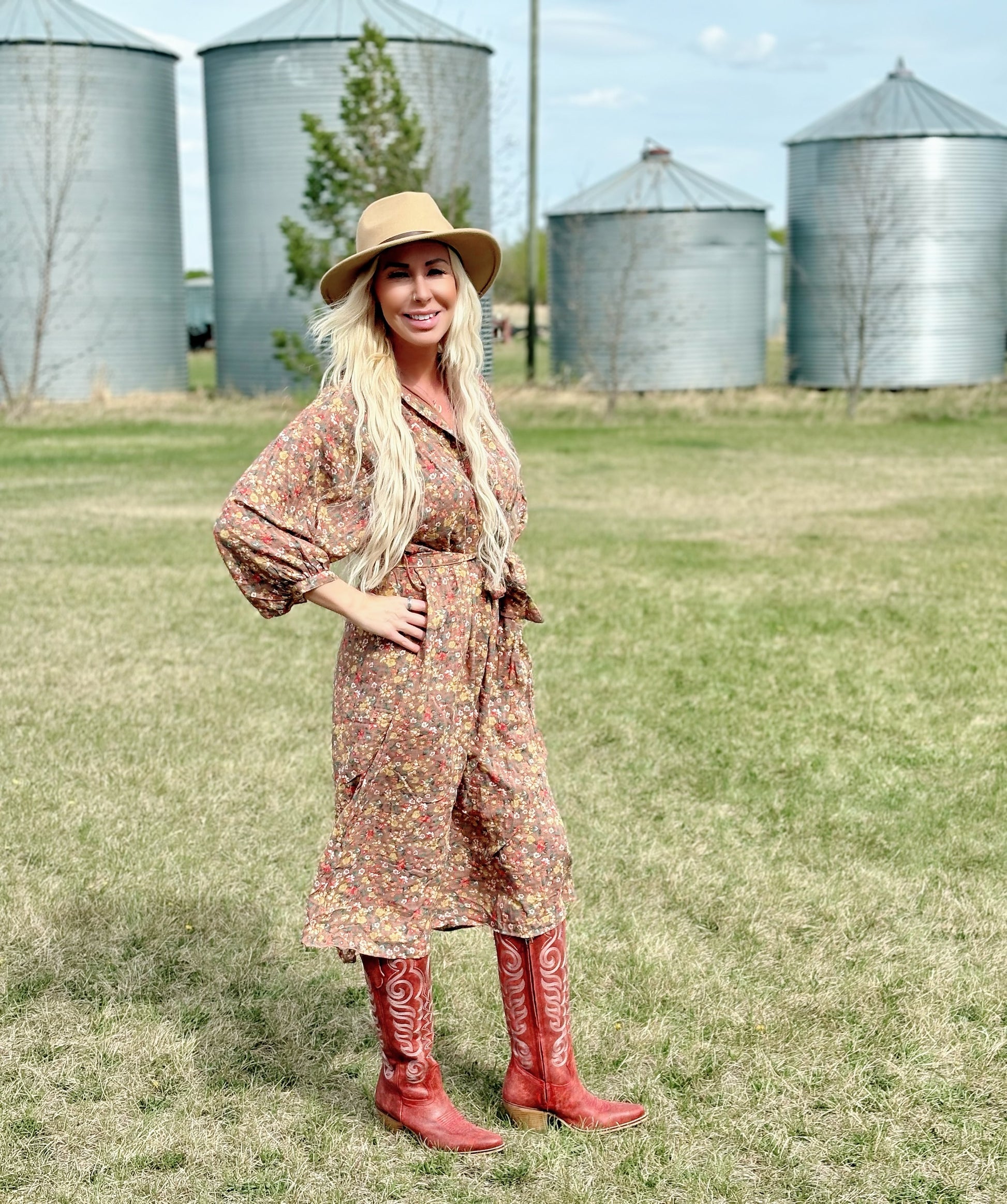 This floral midi-length dress features flattering dolman sleeves with a button up front and cinched tie waist