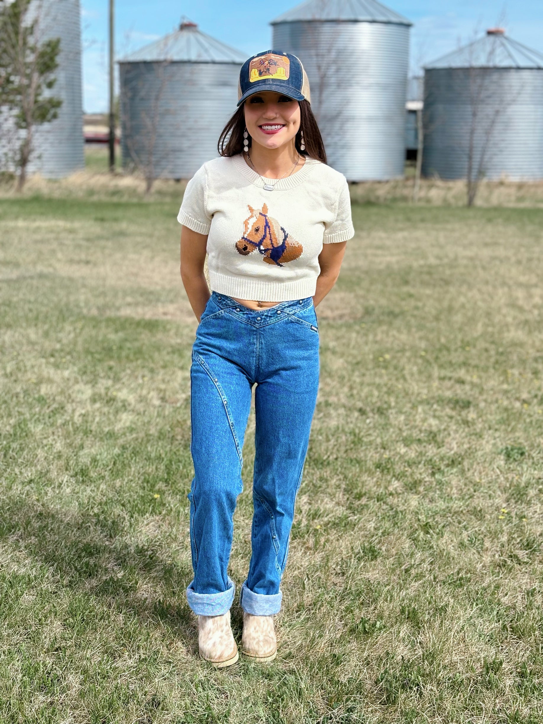 This white knit shirt with its horse graphic on the front is sure to be your favourite this season. A classy spin on your typical graphic tee to look more polished.