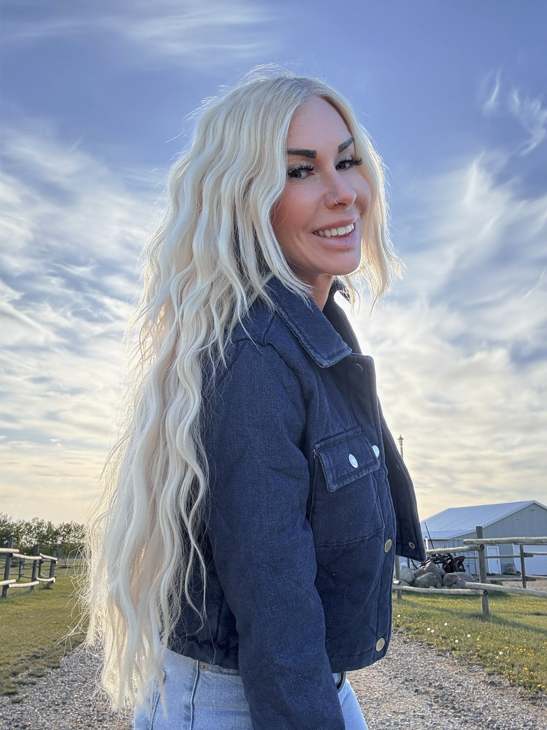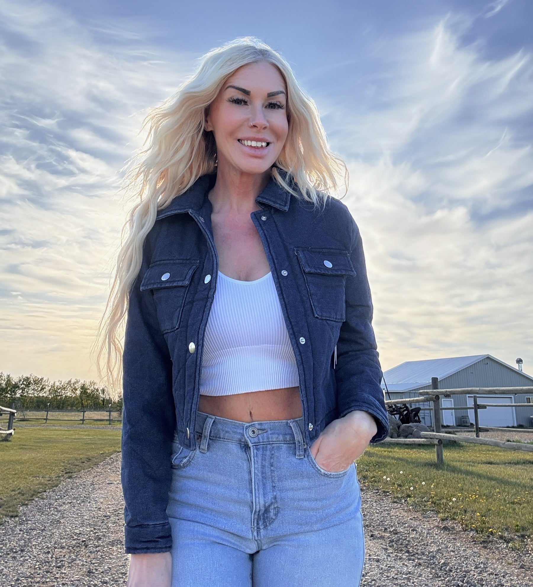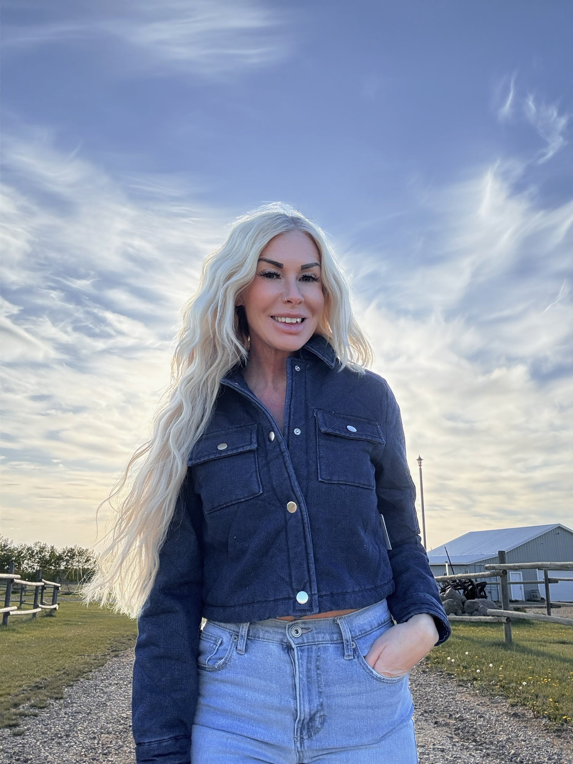 This denim jacket gives a twist with its all-over quilted stitch pattern. It has a shorter boxy fit without being cropped. The perfect lightweight jacket for this summer