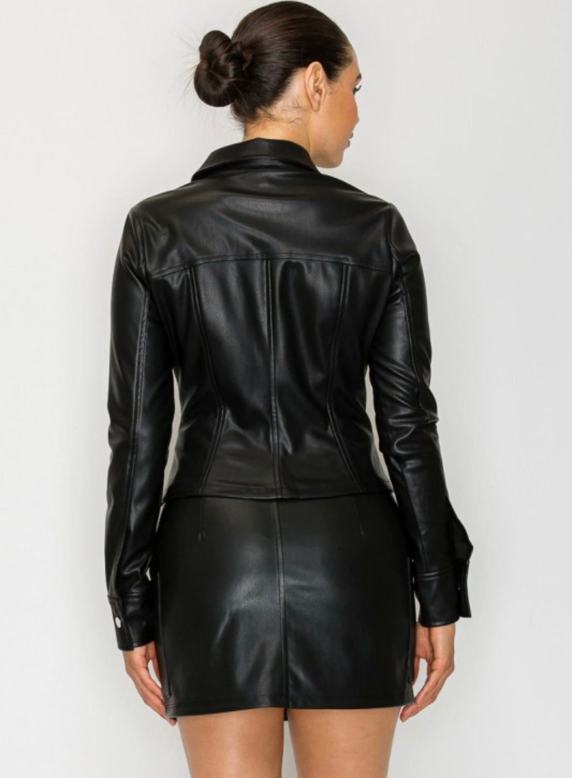 A bold, all-black faux leather top that makes a statement. The fitted button-down jacket features a structured collar, panel detailing, and a flattering tailored silhouette with long sleeves and metallic snap buttons down the front.