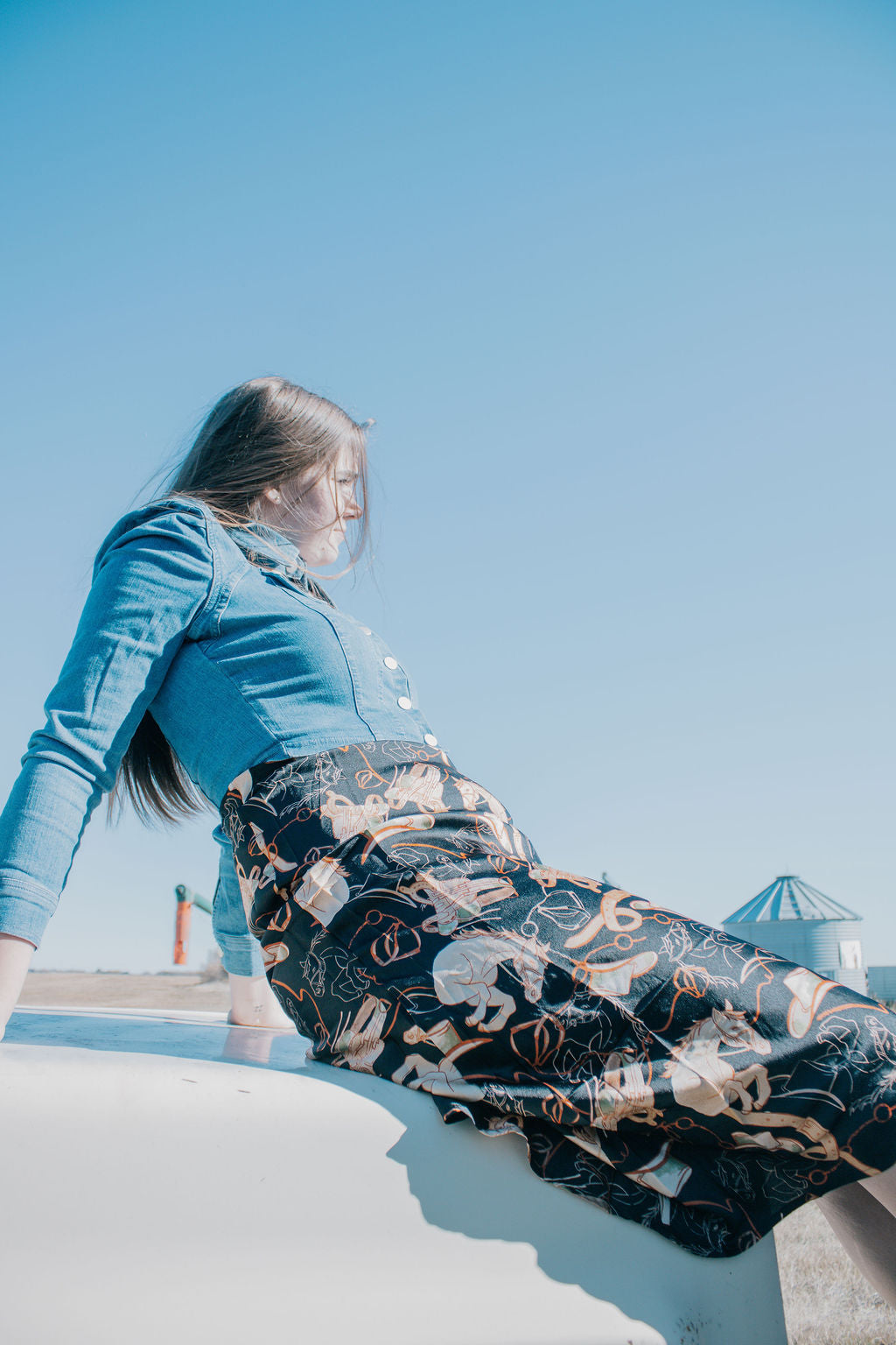 Add a touch of western charm to your look with this flowy maxi skirt. Set against a rich black background, the print features detailed horses, boots, and lasso motifs in warm tan and rust tones. The lightweight fabric drapes beautifully for a flattering, effortless silhouette, while the ankle-length cut pairs perfectly with boots or casual sneakers. Whether styled with a cozy sweater or a tucked-in blouse, this skirt brings movement, personality, and a hint of rodeo flair to your wardrobe