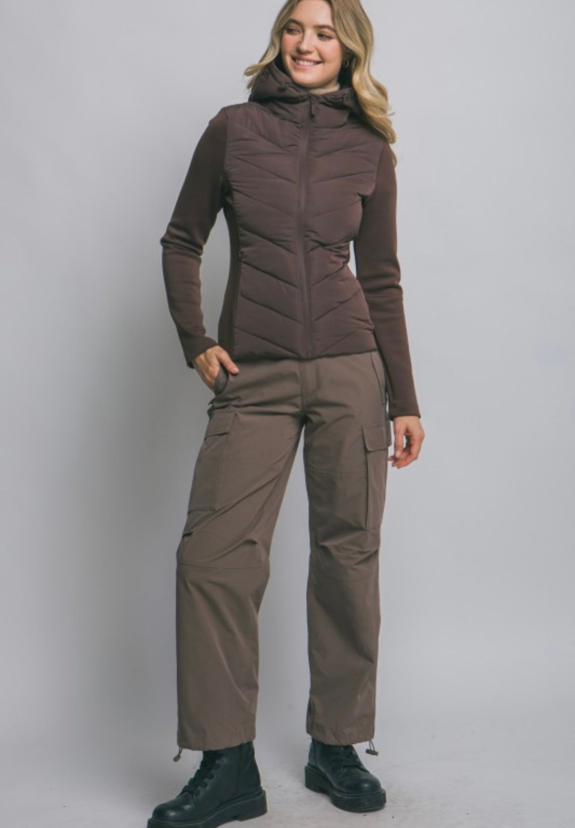 Sleek, lightweight, and ultra-flattering, this black zip-up jacket features a quilted front panel with subtle chevron stitching for added texture and warmth. The fitted silhouette and smooth sleeves create a streamlined look, while the attached hood adds a cozy, functional touch. Perfect for layering on cooler days, it blends sporty comfort with everyday style.