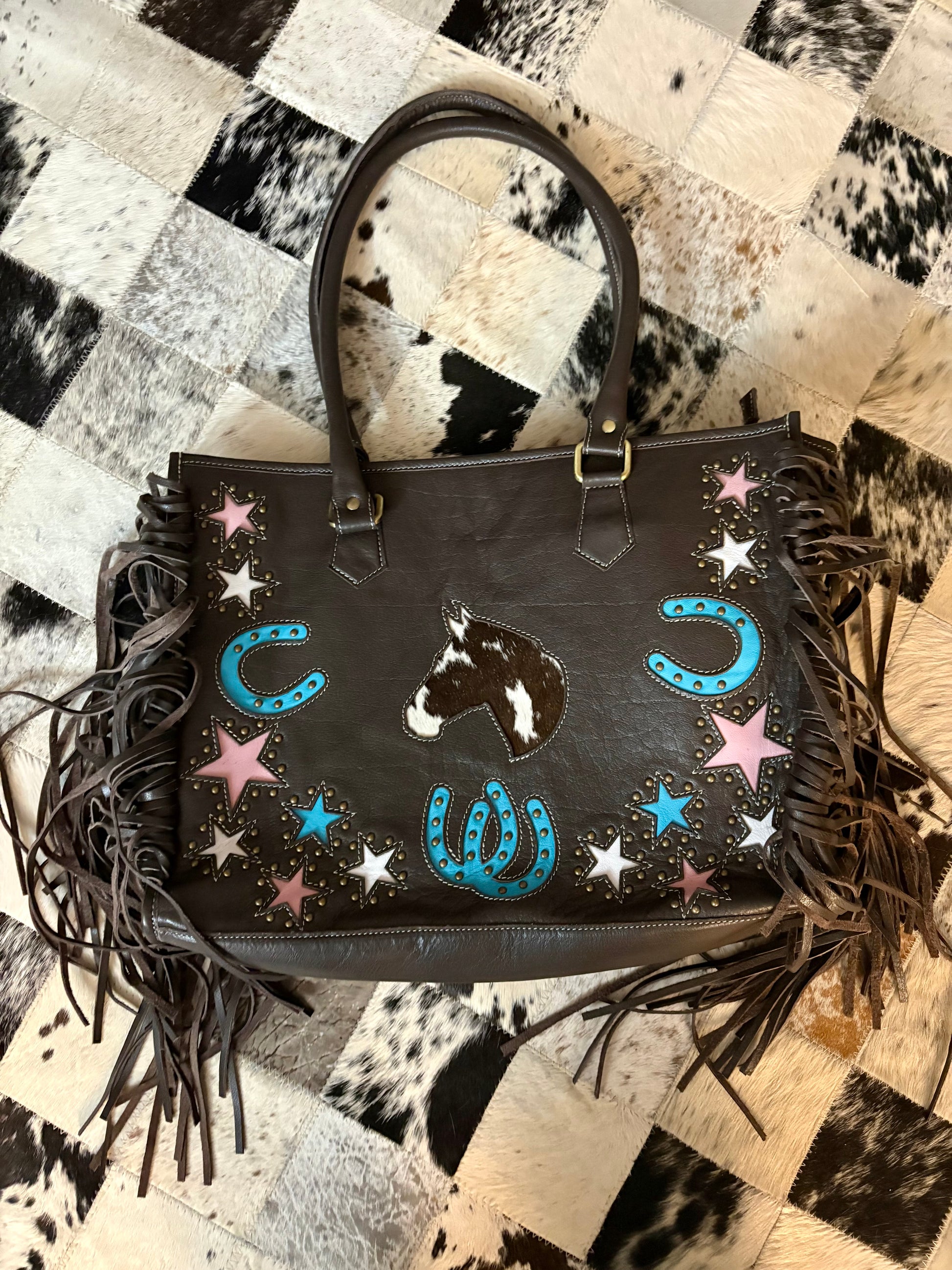 This bold Western Spirit Fringe Tote captures true cowgirl flair with its dark brown leather-look finish and statement fringe sides. The front features a striking horse head centerpiece surrounded by turquoise horseshoes, pink and white stars, and gold stud accents for a playful yet rugged charm. Dual sturdy handles make it perfect for everyday use, while the roomy interior fits all your essentials. A perfect mix of western attitude and boho fun — ideal for rodeo days, markets, or nights out on the ranch.