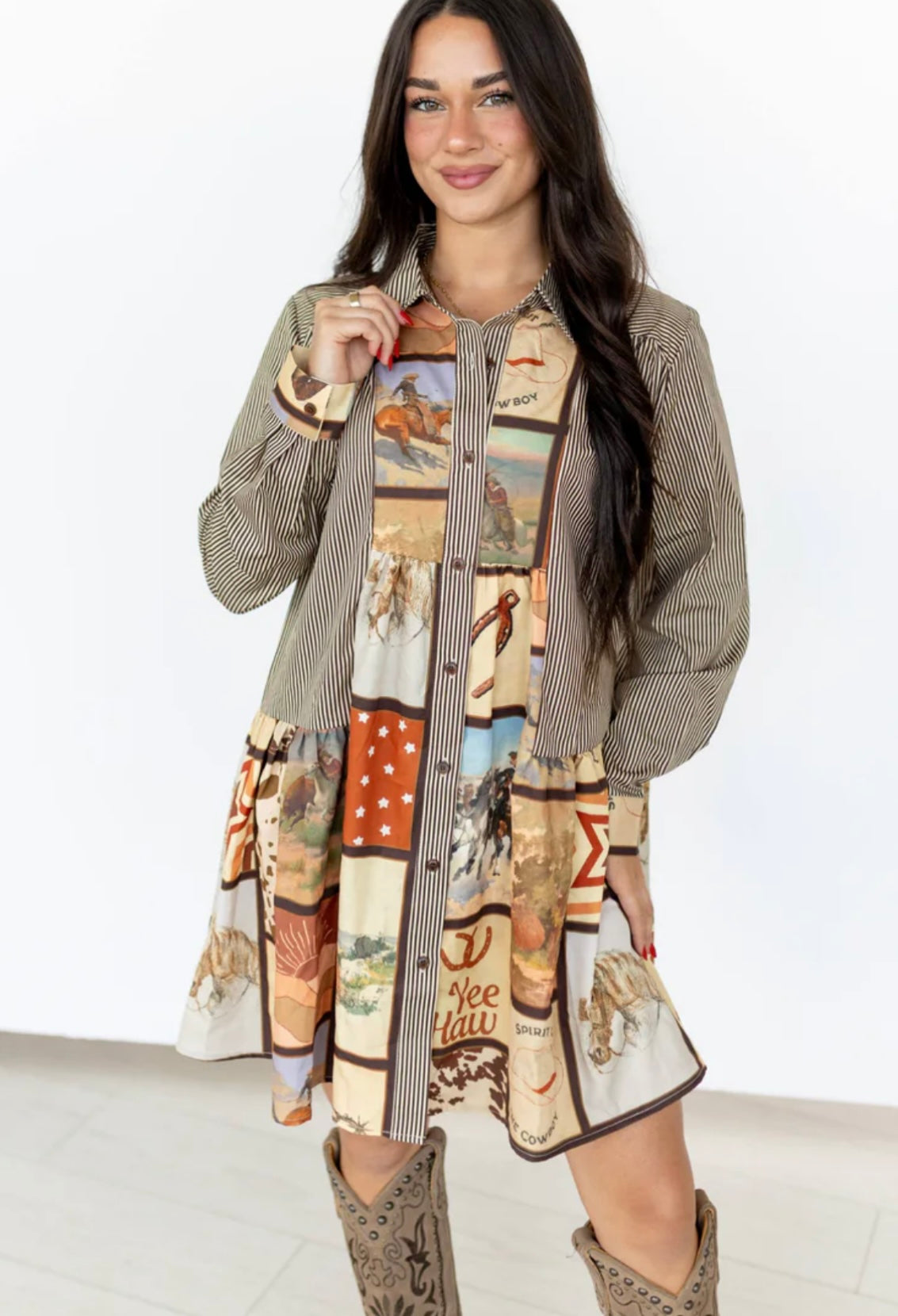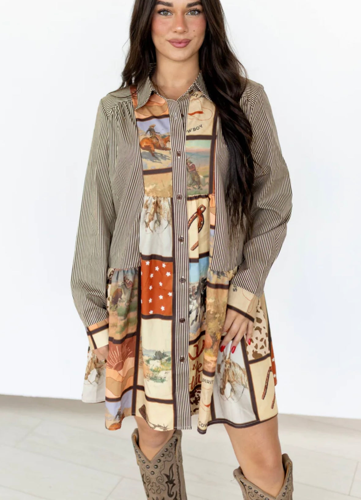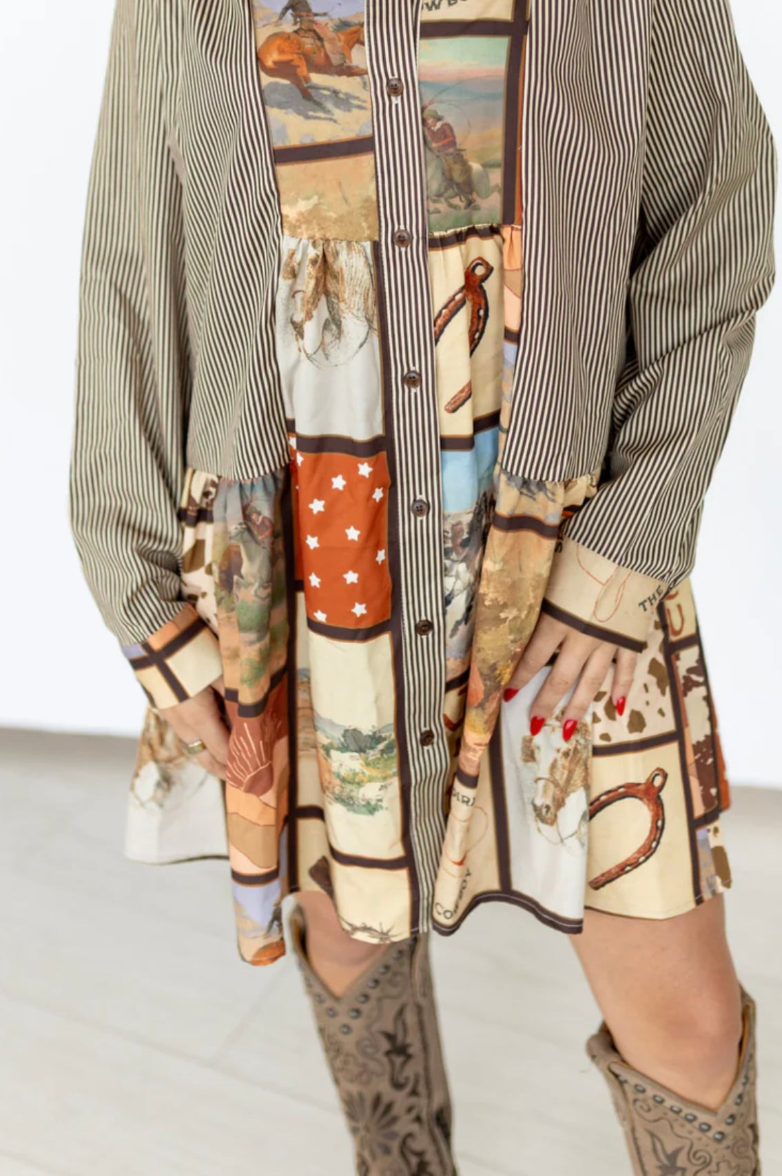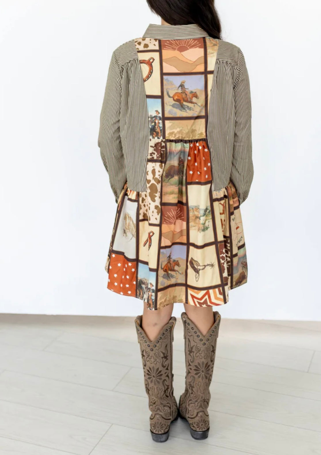 This long sleeve shirt dress features a distinctive western-inspired patchwork design combined with classic pinstripes. The upper portion and sleeves are constructed from a brown and cream vertical stripe fabric, while the lower panel showcases mixed printed square patches with cowboy-themed imagery, stars, and rope graphics. It includes a full button-down front, structured collar, and pleated seam below the bust for added volume and movement. Ideal as a statement piece for western or vintage-themed boutique collections.